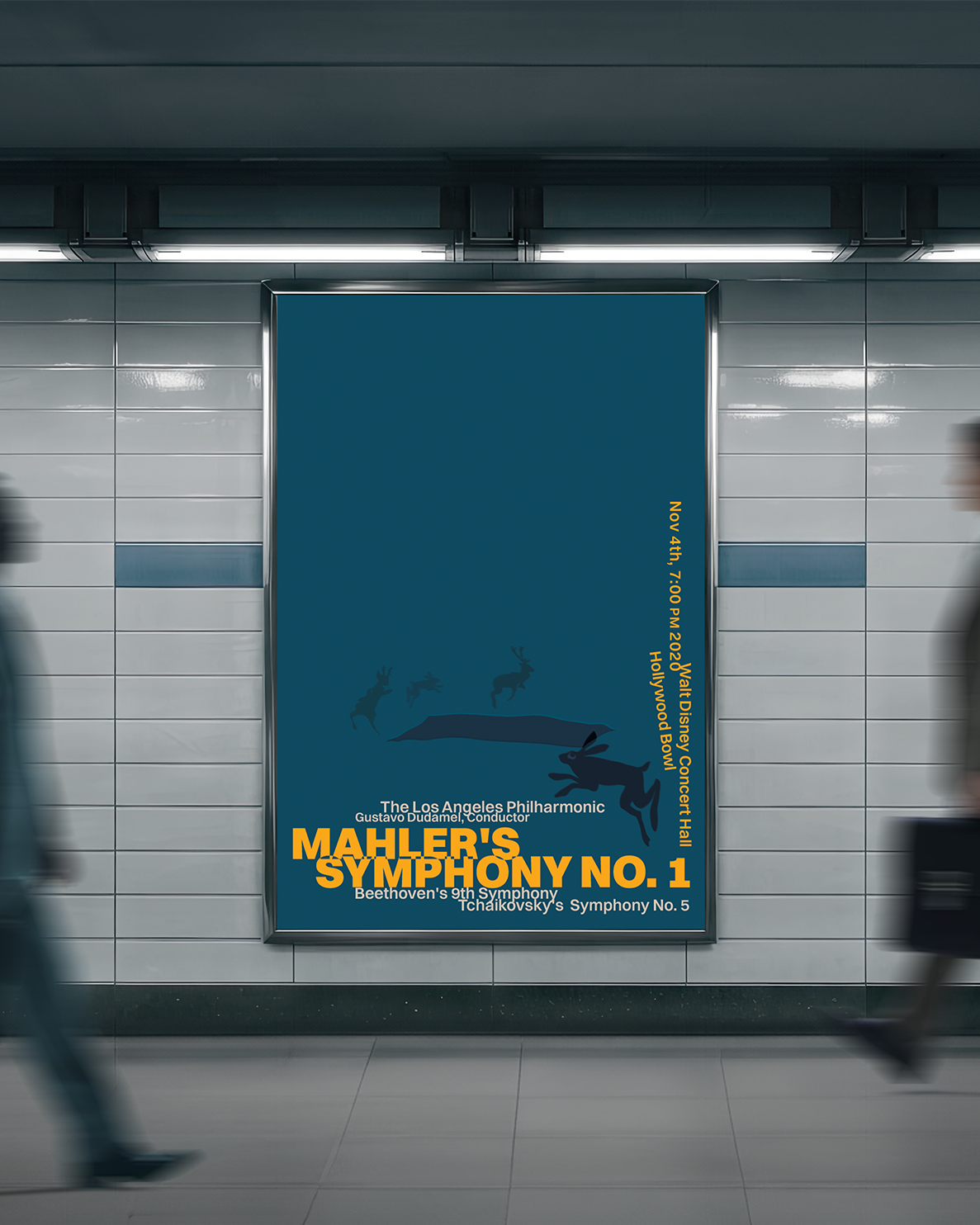 The goal for this project was to create a classical concert poster for a concert by the Los Angeles Philharmonic playing Mahler’s Symphony No. 1 (headline), Beethoven’s 9th Symphony, and Tchaikovsky’s Symphony No. 5. The poster was supposed to feel modern and eye-catching, while utilizing the idea of typographical systems.