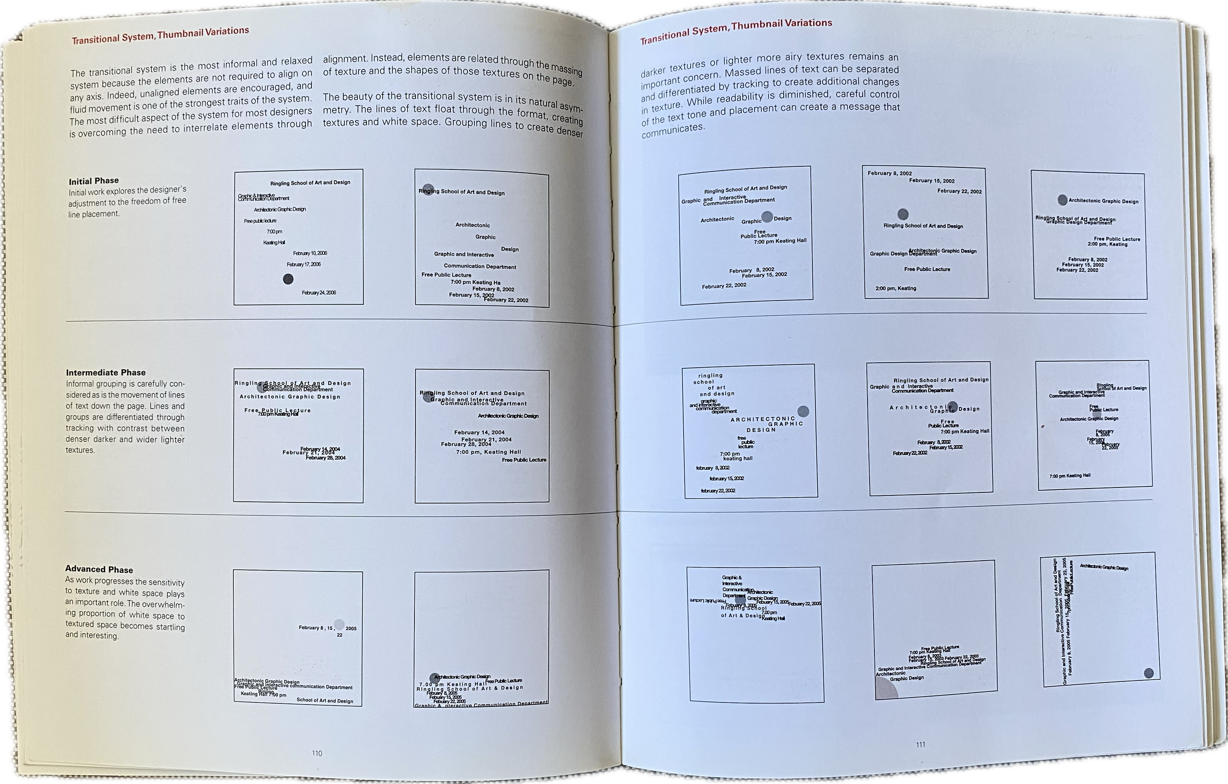That said, some of the systems were not well-suited for a promotional poster, as they need to catch the viewers’ attention in an instant. The transitional system caught my eye as it can still be very legible, while still creating tension and movement. In the basic variations of the transitional system, the lines are typically parallel in one direction, resulting in all lines being either horizontal or vertical. However, there is a variation where the repetition is interrupted by breaking the lines, like in this example, inserting vertical lines in a primarily horizontal line composition. Elam phrases this composition as if “the eye comes to a screeching halt where horizontal and vertical type meet.”